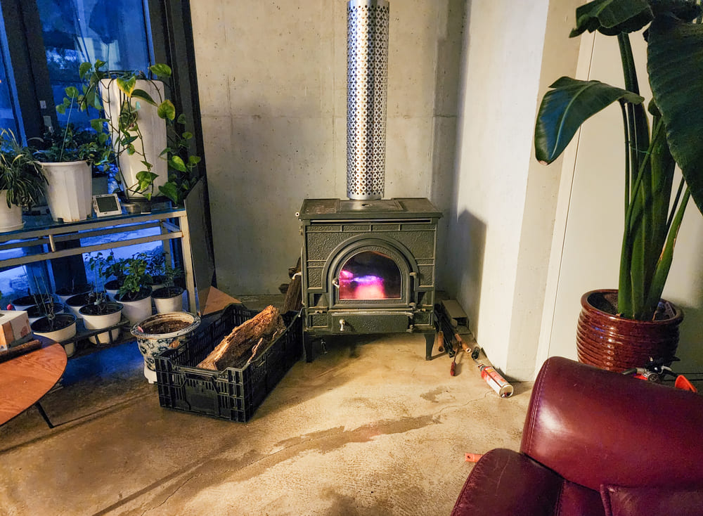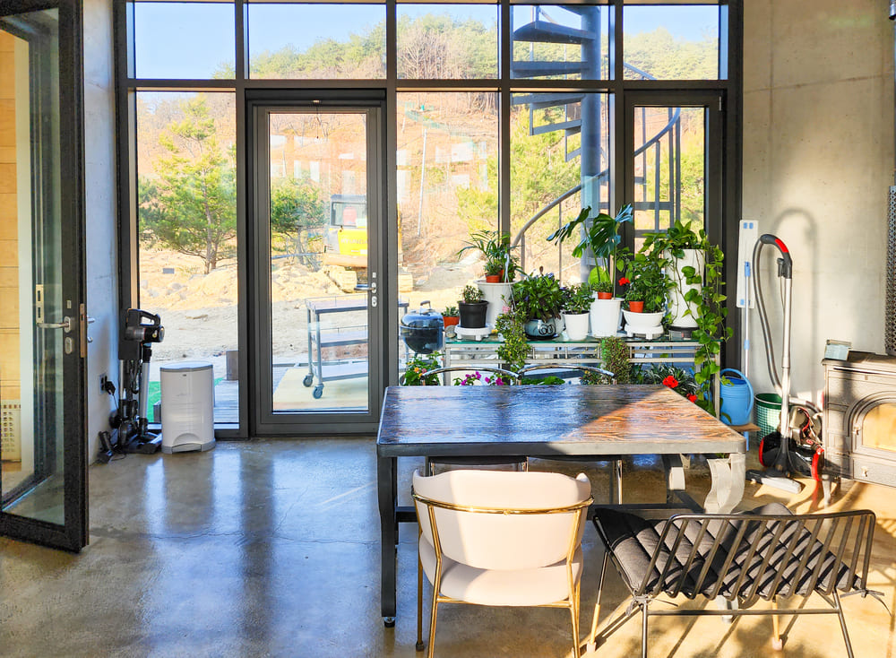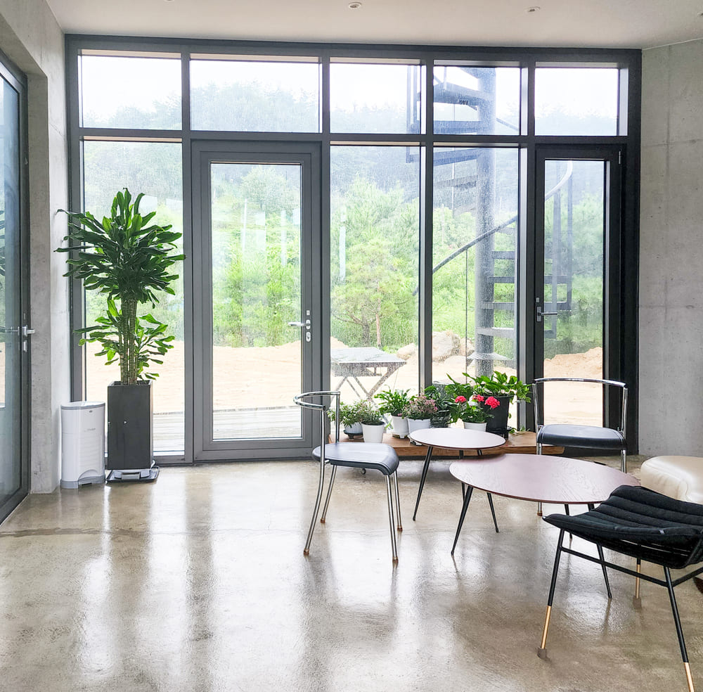 * 알파룸 – 대형 식물들과 벽난로 테이블 의자